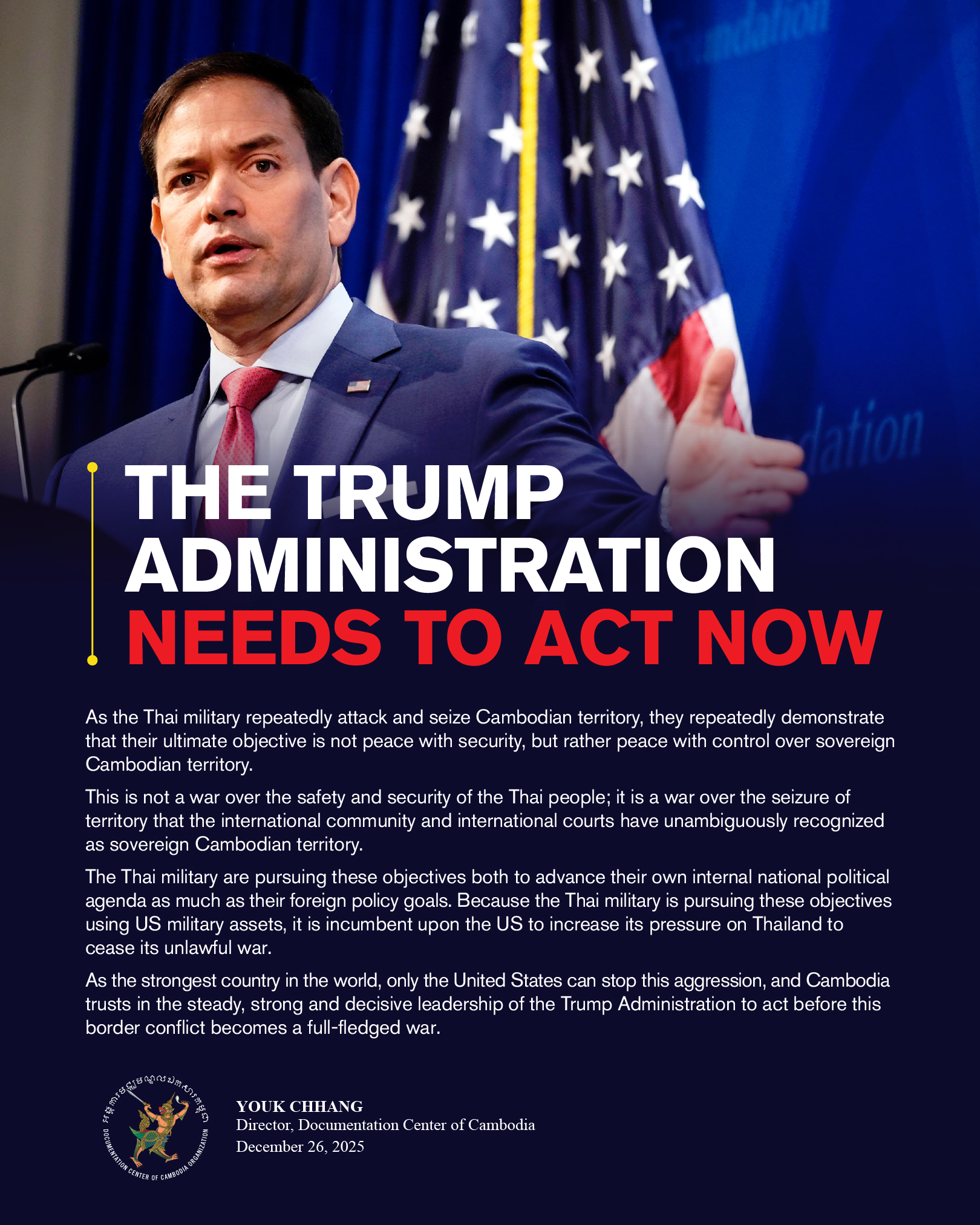 DC-Cam was founded in 1995, as an adjunct of Yale University, pursuant to the Cambodian Genocide Justice Act of 1994, Public Law 103–236, for purposes of collecting relevant data on the crimes of genocide and other atrocity crimes committed by the Khmer Rouge regime (1975-1979). In 1997, DC-Cam became an independent legal entity recognized under both Cambodian and U.S. law, with a core mission to collect, preserve, and raise public awareness of the history of the Khmer Rouge regime.